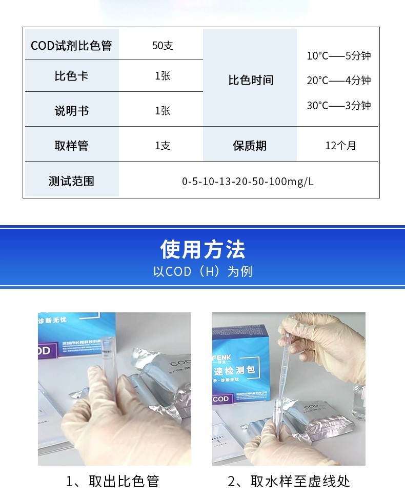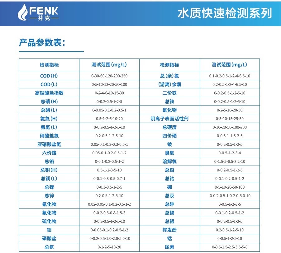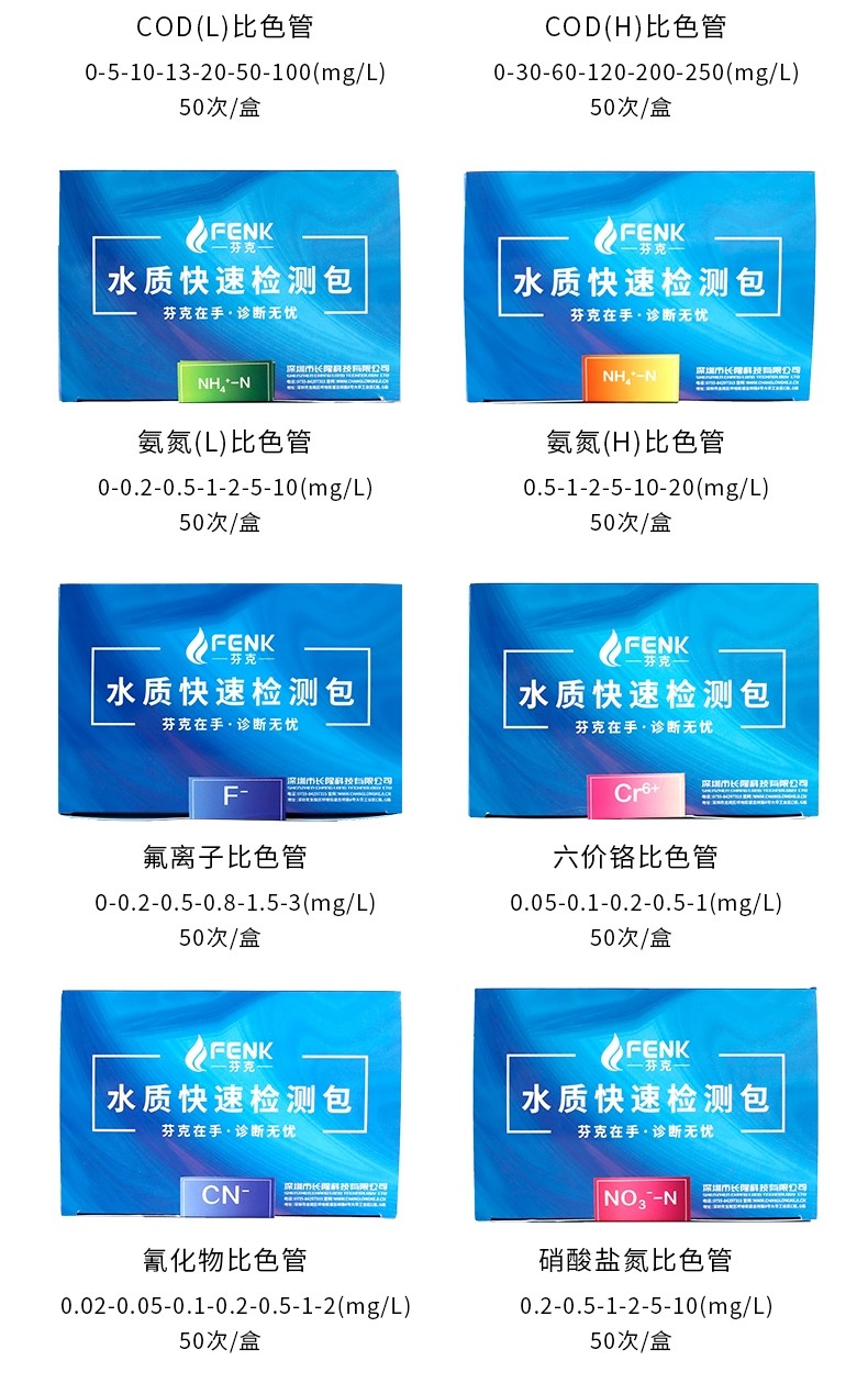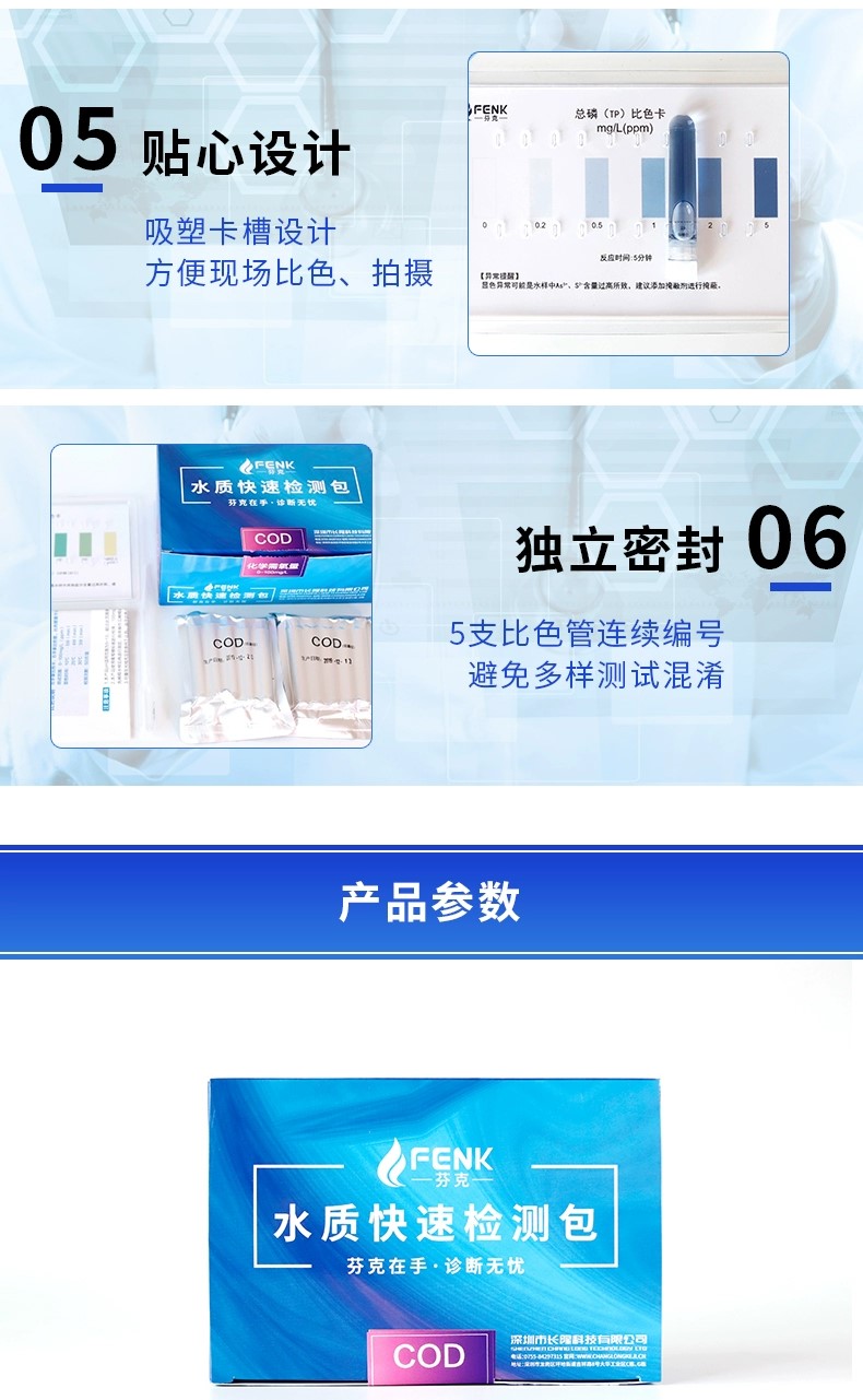 產品簡介:芬克水質快速檢測:批量式樣品檢測,快至1分鐘。準確:依據國標方法開發強抗干擾試劑,申請專利保護。便攜:比色管獨立包裝,可放進口袋。