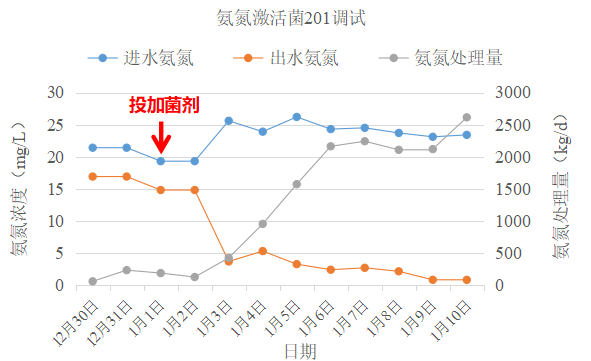 庫(kù)巴魯®氨氮激活菌201投加3日后出水氨氮開始降低,系統(tǒng)硝化能力明顯好轉(zhuǎn)